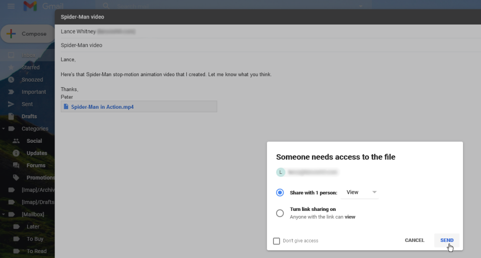 After you try to send your email, you’re asked to provide your recipient access to the file. By default, the file is available just for viewing. You can opt to allow the person to review or edit the file, but they would need a Google account to perform either action.