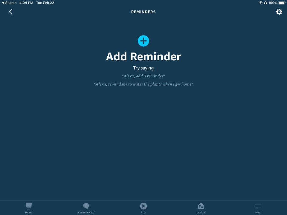 Alternatively, set up a reminder through the Alexa app. Open the app, tap the More icon in the lower right, and then select Reminders. At the Reminders screen, tap the Add Reminder button.