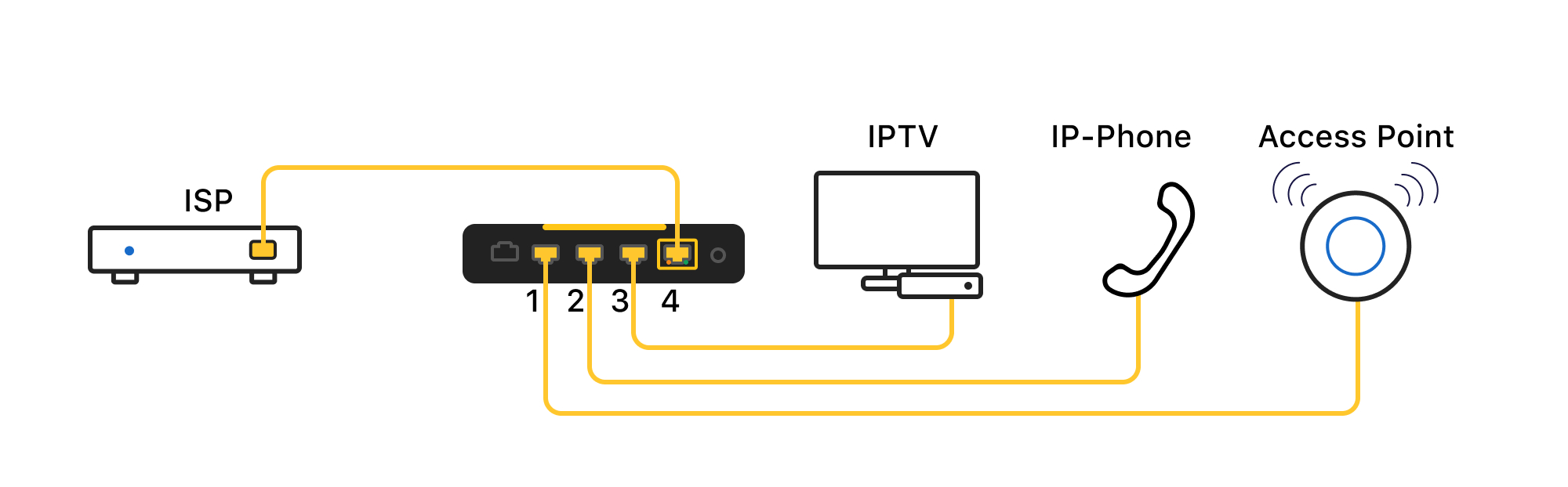 In this example, Firewalla Gold is connected to your modem through Port 4, which is the default port for internet connection.