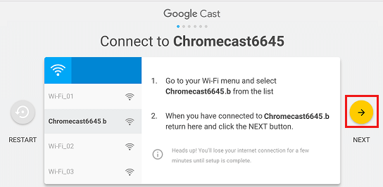 6. After connecting to Chromecast’s open WiFi Network, click on the Next button (See image below)