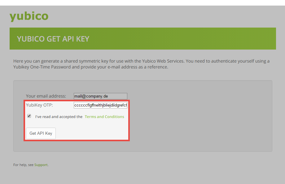 An API key must be requested for configuration. For this purpose, use the following link and enter an e-mail address: https://upgrade.yubico.com/getapikey/