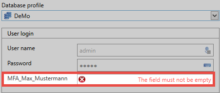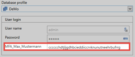 To log in with Multifactor Authentication, the database is first selected and then User Name and Password are entered and confirmed.