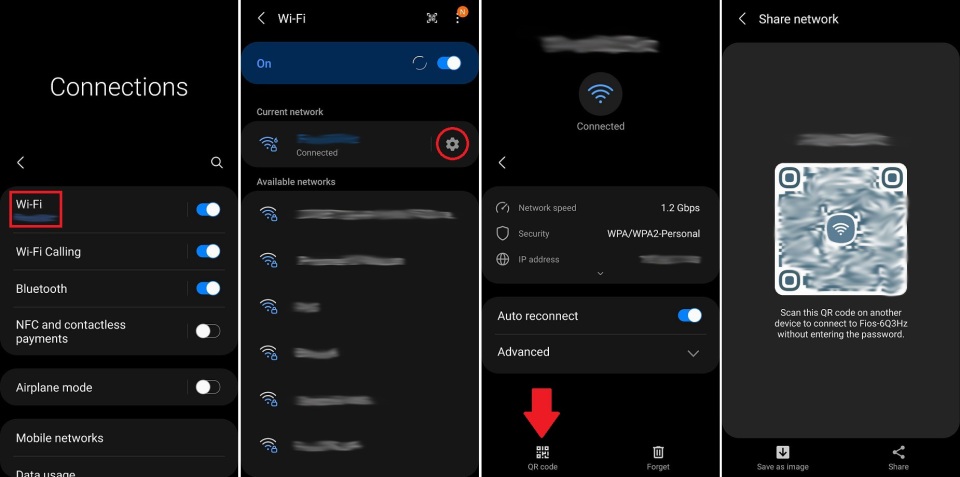 The network that is selected should also have a gear icon next to the network name. Tap the gear, then select the QR code icon at the bottom of the screen. A unique QR code will be generated, which you can then save to your phone or share to a contact.