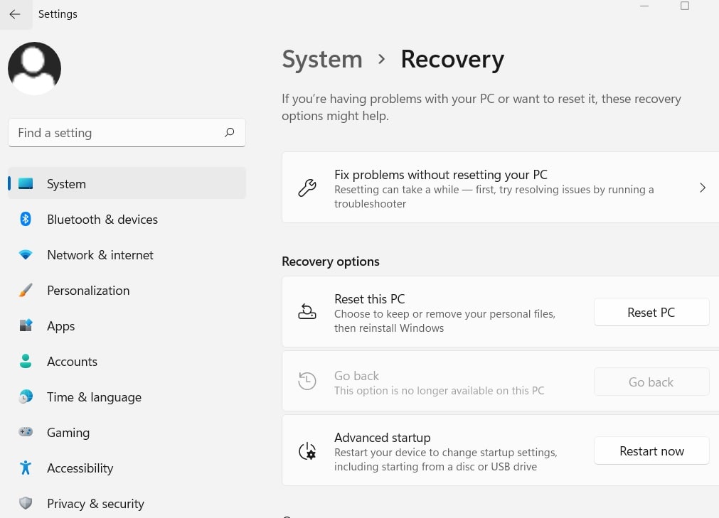 2. Click on the system then scroll down on the right and select the ‘Recovery’ option.