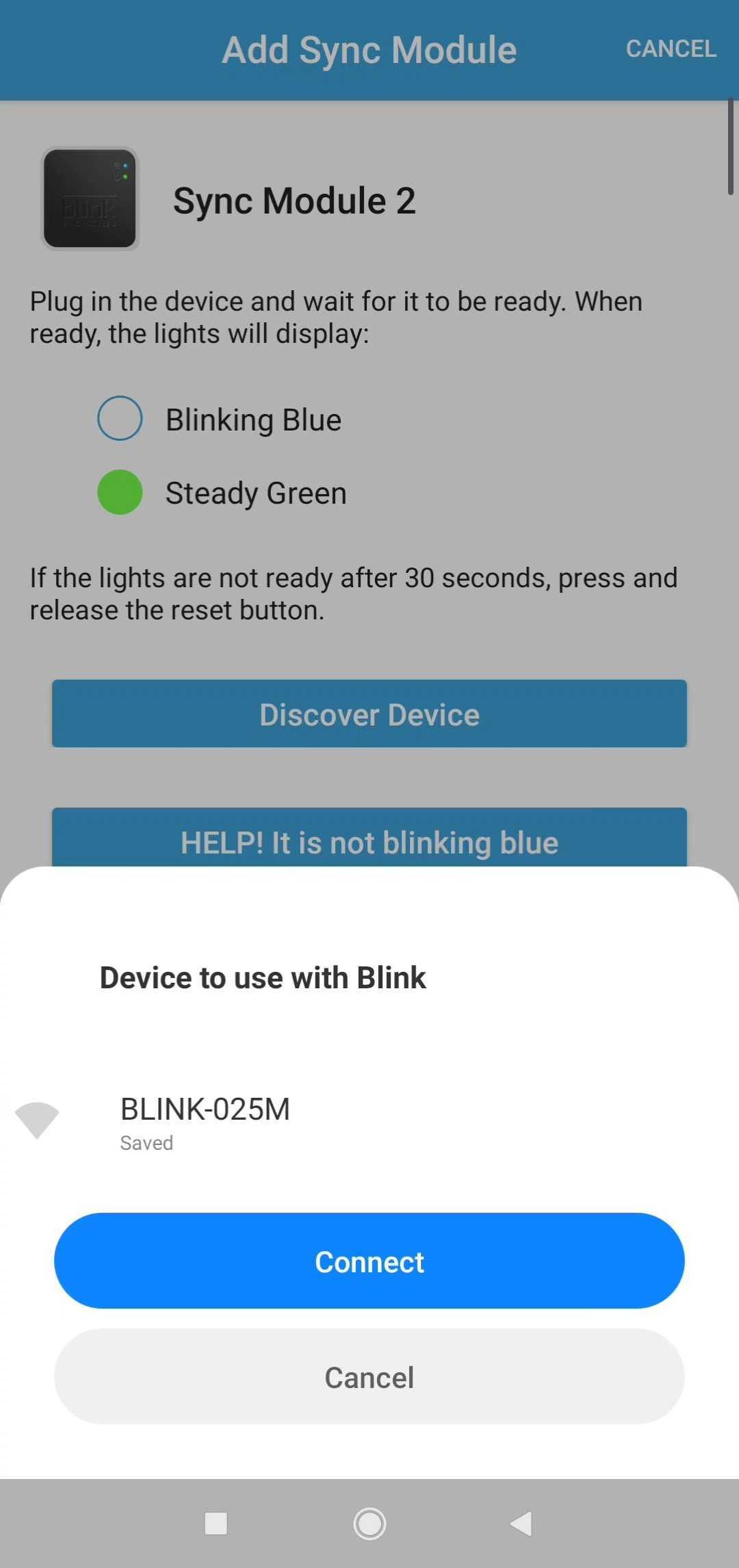 When adding a Sync Module, Blink Mini camera or Video Doorbell, you will be prompted to connect your Blink app to the local Wi-Fi networks for those devices. It is named “BLINK-" followed by the four digits from the Sync Module or Mini serial number. The Sync Module manages communications between your Blink devices and our secure servers; therefore, your camera needs to connect to its local Wi-Fi. Mini cameras do not require sync modules for those communications, which is why they broadcast their own local Wi-Fi connections.