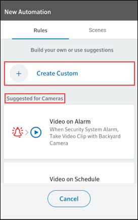 4. On the New Automation screen, they need to tap Rules to display suggested rules for installed devices or to create a rule.