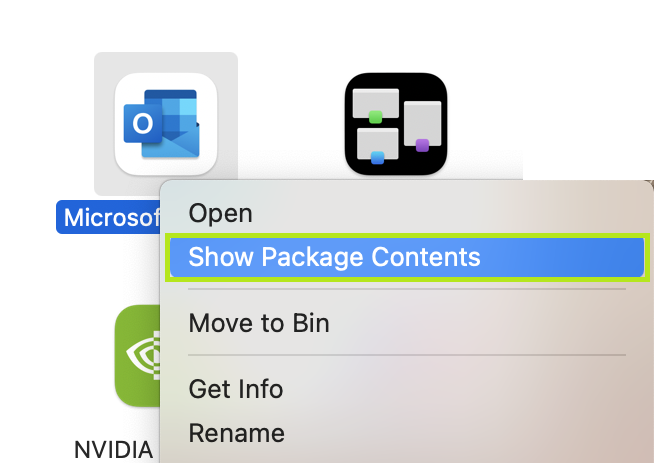 Right-Click Microsoft Outlook, and select Show Package Contents