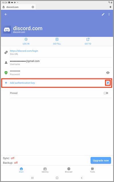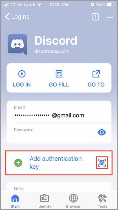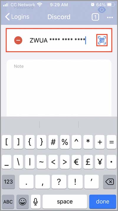 6) Underneath your login credentials, you will see an option to enable two-factor authentication for this Login. Tap the blue [+] button, or tap the QR code button to scan a site's QR code.